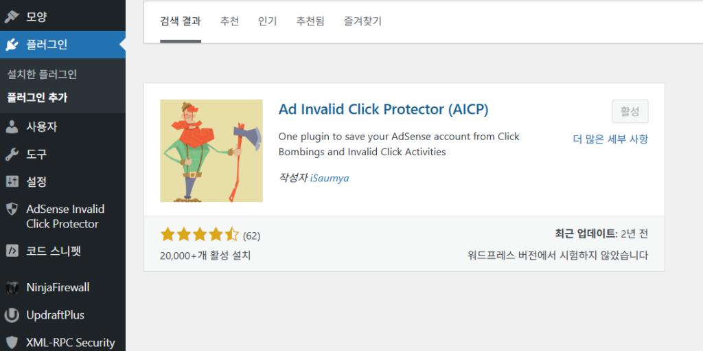 - 플러그인 메뉴에서 AdSense Invalid Click Protector를 검색해서 설치 및 활성화합니다.