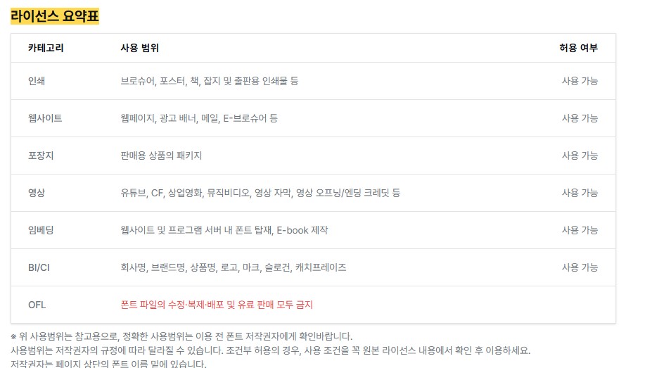 - [눈누(Noonnu)] 같은 상업용 무료 폰트 사이트에서 라이선스 범위를 꼭 확인하고 쓰세요. (허용 범위에 ‘BI/CI’, ‘임베딩’ 등 복잡한 말이 많지만, ‘웹사이트 이미지 제작 허용’ 문구를 확인하면 됩니다.)